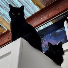Ruby is still learning to trust people, but you can tell she really wants to. Her kittens are all independent now but she can often be found cuddled up with them. She is getting braver and will sit and watch us as we work. She has incredible bright eyes that shine out of her pitch black face. She is beautiful and energetic.