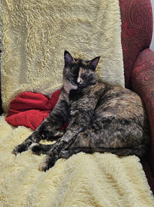 Sassy is a beautiful tortie who came to LCCR with two newborn kittens; she subsequently accepted three more kittens who were orphans and began raising them as her own. Those kittens are all grown up now, but Sassy still shares a special bond with her son, Sundae.